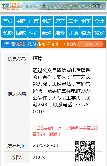 通过公众号微信或电话联系客户合作,要求:语言表达能力强,思维灵活,有销售经验,能熟练掌握电脑及办公软件,大专以上学历,底薪2500,联系电话13717810010 【电话咨询时,请一定说明在望奎信息网看到的,谢谢!】 |