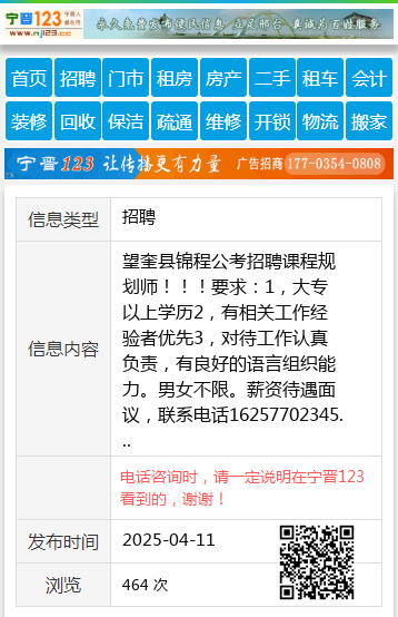 望奎县锦程公考招聘课程规划师!!!要求:1,大专以上学历2,有相关工作经验者优先3,对待工作认真负责,有良好的语言组织能力。男女不限。薪资待遇面议,联系电话16257702345 【电话咨询时,请一定说明在望奎信息网看到的,谢谢!】 |