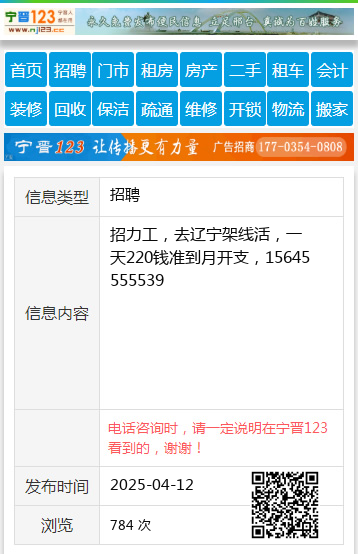 招力工,去辽宁架线活,一天220钱准到月开支,15645555539