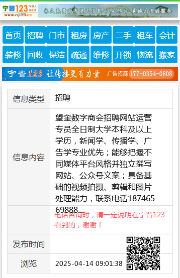 全日制大学本科及以上学历,新闻学、传播学、广告学专业优先;能够把握不同媒体平台风格并独立撰写网站、公众号文案;具备基础的视频拍摄、剪辑和图片处理能力,联系电话18746569888 【电话咨询时,请一定说明在望奎信息网看到的,谢谢!】 |