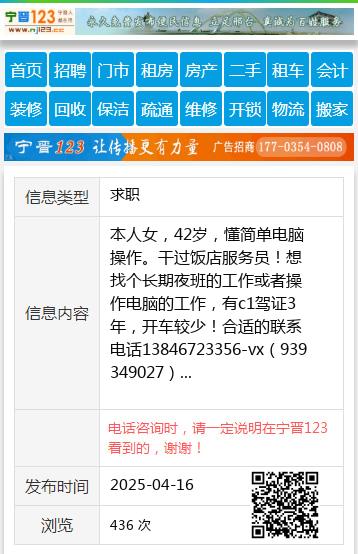 本人女,42岁,懂简单电脑操作。干过饭店服务员!想找个长期夜班的工作或者操作电脑的工作,有c1驾证3年,开车较少!合适的联系电话13846723356-vx(939349027) 【电话咨询时,请一定说明在望奎信息网看到的,谢谢!】 |