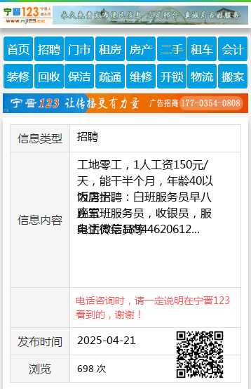 工地零工,1人工资150元/天,能干半个月,年龄40以内男士。 饭店招聘:白班服务员早八晚五, 正常班服务员,收银员,服务生传菜员等 电话微信18944620612