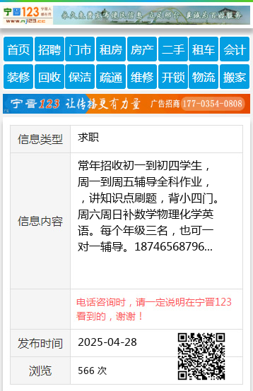 常年招收初一到初四学生,周一到周五辅导全科作业,,讲知识点刷题,背小四门。周六周日补数学物理化学英语。每个年级三名,也可一对一辅导。18746568796 【电话咨询时,请一定说明在望奎信息网看到的,谢谢!】 |