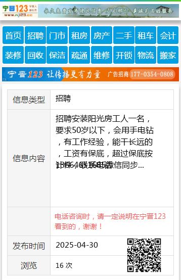 招聘安装阳光房工人一名,要求50岁以下,会用手电钻,有工作经验,能干长远的,工资有保底,超过保底按计件,联系电话 13664651685微信同步