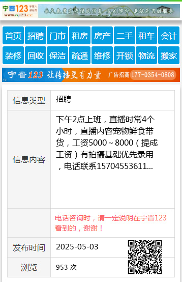 下午2点上班,直播时常4个小时,直播内容宠物鲜食带货,工资5000~8000(提成工资)有拍摄基础优先录用,电话联系15704553611 【电话咨询时,请一定说明在望奎信息网看到的,谢谢!】 |