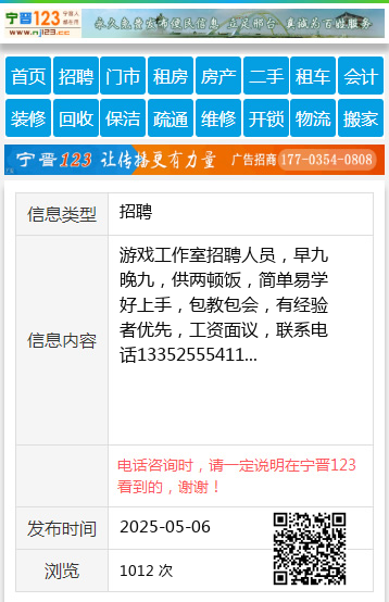游戏工作室招聘人员,早九晚九,供两顿饭,简单易学好上手,包教包会,有经验者优先,工资面议,联系电话13352555411
