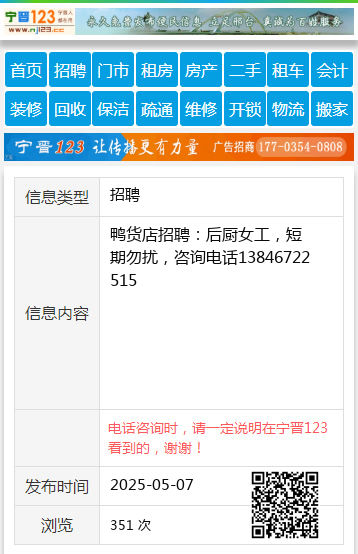鸭货店招聘:后厨女工,短期勿扰,咨询电话13846722515