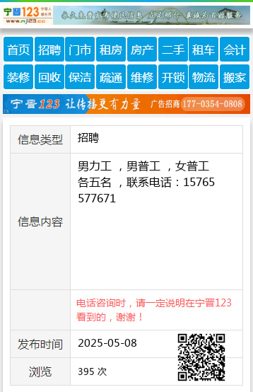男力工 ,男普工 ,女普工 各五名 ,联系电话:15765577671