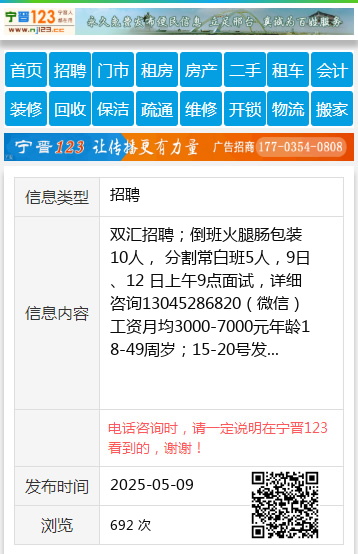 双汇招聘;倒班火腿肠包装10人, 分割常白班5人,9日、12 日上午9点面试,详细咨询13045286820(微信)工资月均3000-7000元年龄18-49周岁;15-20号发 【电话咨询时,请一定说明在望奎信息网看到的,谢谢!】 |