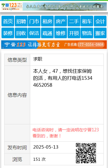 本人女,47,想找住家保姆的活,有用人的打电话15344652058