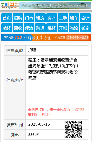 杂工:女年龄25到55 要求:干净利索肯吃苦适合宝妈陪读 时间:上午7点到10点下午12点30到1点30 电话:15545533605 地址:大医院东门到北老段肉店