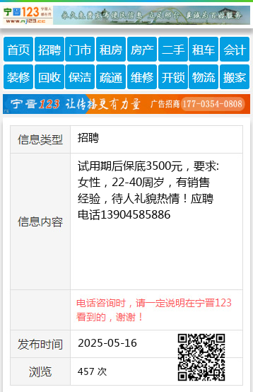 试用期后保底3500元,要求:女性,22-40周岁,有销售经验,待人礼貌热情!应聘电话13904585886 【电话咨询时,请一定说明在望奎信息网看到的,谢谢!】 |