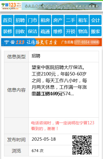 望奎中医院招聘大厅保洁。工资2100元,年龄50-60岁之间,每天工作八小时,每月两天休息,工作满一年涨工龄工资100元