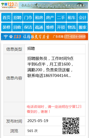 招聘服务员,工作时间9点半到6点半,月工资1600,满勤200,负责卖货送餐,联系电话18697044144