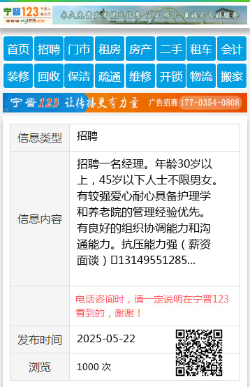 招聘一名经理。年龄30岁以上,45岁以下人士不限男女。有较强爱心耐心具备护理学和养老院的管理经验优先。有良好的组织协调能力和沟通能力。抗压能力强(薪资面谈)☎13149551285 【电话咨询时,请一定说明在望奎信息网看到的,谢谢!】 |