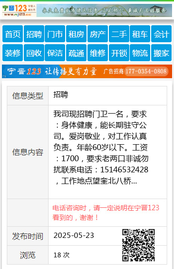 我司现招聘门卫一名,要求:身体健康,能长期驻守公司。爱岗敬业,对工作认真负责。年龄60岁以下。工资:1700,要求老两口非诚勿扰联系电话:15146532428,工作地点望奎北八桥 【电话咨询时,请一定说明在望奎信息网看到的,谢谢!】 |