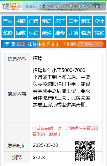 招聘长年小工5000-7000一个月能干到上冻以后。主要负责喷漆喷棉打下手,能跟着学成手之后涨工资,要求身体健康能上高,民房高度需要上房顶或者进黑天棚。 【电话咨询时,请一定说明在望奎信息网看到的,谢谢!】 |