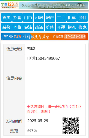 招聘保洁员岗位工资1900-2250元,每周有休息,转正满一年有工龄奖每月100元。要求身体健康,有责任心者优先录用。联系电话:18697076088