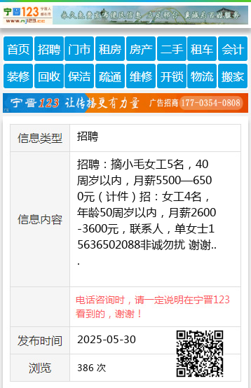 招聘:摘小毛女工5名,40周岁以内,月薪5500—6500元(计件)招:女工4名,年龄50周岁以内,月薪2600-3600元,联系人,单女士15636502088非诚勿扰 谢谢 【电话咨询时,请一定说明在望奎信息网看到的,谢谢!】 |