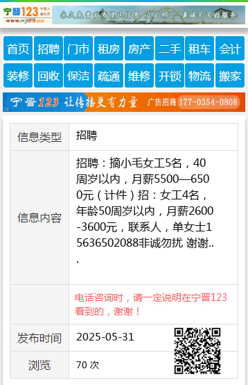 招聘:摘小毛女工5名,40周岁以内,月薪5500—6500元(计件)招:女工4名,年龄50周岁以内,月薪2600-3600元,联系人,单女士15636502088非诚勿扰 谢谢 【电话咨询时,请一定说明在望奎信息网看到的,谢谢!】 |
