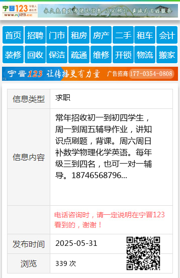 常年招收初一到初四学生,周一到周五辅导作业,讲知识点刷题,背课。周六周日补数学物理化学英语。每年级三到四名,也可一对一辅导。18746568796 【电话咨询时,请一定说明在望奎信息网看到的,谢谢!】 |