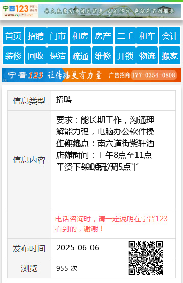 工资:3000元/月 【电话咨询时,请一定说明在望奎信息网看到的,谢谢!】 |