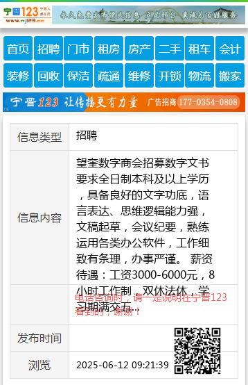 望奎数字商会招募数字文书 要求全日制本科及以上学历,具备良好的文字功底,语言表达、思维逻辑能力强,文稿起草,会议纪要,熟练运用各类办公软件,工作细致有条理,办事严谨。 薪资待遇:工资3000-6000元,8小时工作制,双休法休,学习期满交五险,联系电话13089971175。