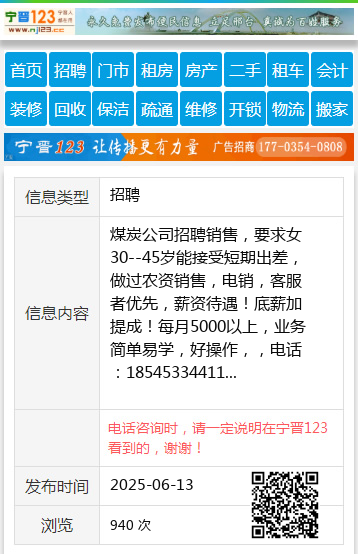 煤炭公司招聘销售,要求女30--45岁能接受短期出差,做过农资销售,电销,客服者优先,薪资待遇!底薪加提成!每月5000以上,业务简单易学,好操作,,电话:18545334411 【电话咨询时,请一定说明在望奎信息网看到的,谢谢!】 |