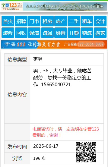 男,36,大专毕业,能吃苦耐劳,想找一份稳定点的工作 15665040721