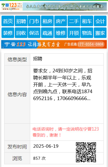 要求女,24到30岁之间,招聘长期半年一年以上,乐观开朗,上一天休一天,早九点到晚九点,联系电话18746952116,17066096666