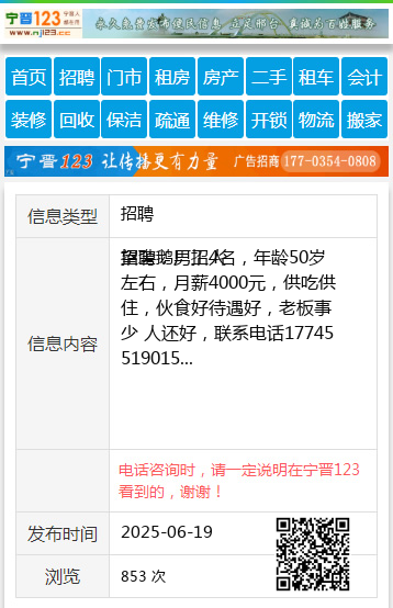 招聘:男工4名,年龄50岁左右,月薪4000元,供吃供住,伙食好待遇好,老板事少 人还好,联系电话17745519015 【电话咨询时,请一定说明在望奎信息网看到的,谢谢!】 |