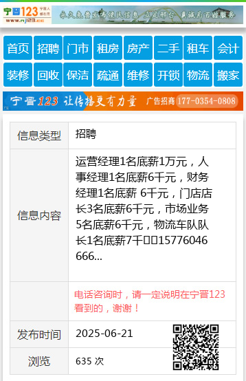 运营经理1名底薪1万元,人事经理1名底薪6千元,财务经理1名底薪 6千元,门店店长3名底薪6千元,市场业务5名底薪6千元,物流车队队长1名底薪7千☎️15776046666 【电话咨询时,请一定说明在望奎信息网看到的,谢谢!】 |