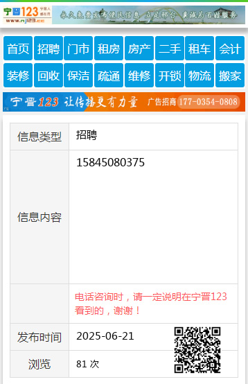 通过公众号微信或电话联系客户合作,要求:语言表达能力强,思维灵活,有销售经验,能熟练掌握电脑及办公软件,学历不限,底薪2500,联系电话13717810010