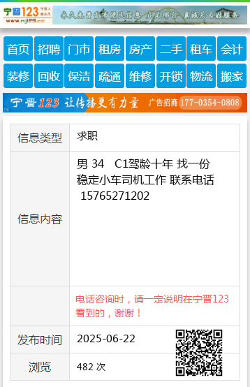 男 34 C1驾龄十年 找一份稳定小车司机工作 联系电话 15765271202
