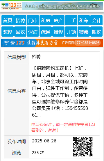 【招聘网约车司机】上班,周租,月租,都可以,京牌车,北京全域可跑工作时间自由,弹性工作制,多劳多得,公司提供车辆,多种车型可选择维修保养保险都是公司负责电话:15945559361 【电话咨询时,请一定说明在望奎信息网看到的,谢谢!】 |