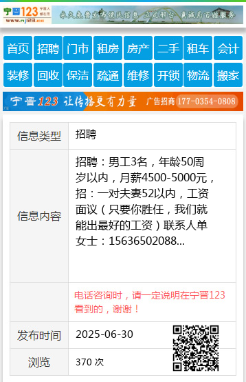 招聘:男工3名,年龄50周岁以内,月薪4500-5000元,招:一对夫妻52以内,工资面议(只要你胜任,我们就能出最好的工资)联系人单女士:15636502088 【电话咨询时,请一定说明在望奎信息网看到的,谢谢!】 |