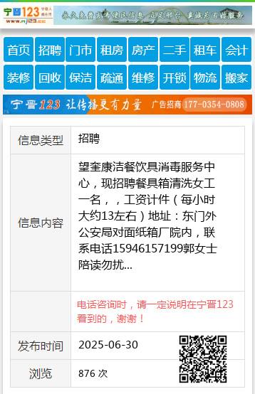 望奎康洁餐饮具消毒服务中心,现招聘餐具箱清洗女工一名,,工资计件(每小时大约13左右)地址:东门外公安局对面纸箱厂院内,联系电话15946157199郭女士陪读勿扰 【电话咨询时,请一定说明在望奎信息网看到的,谢谢!】 |