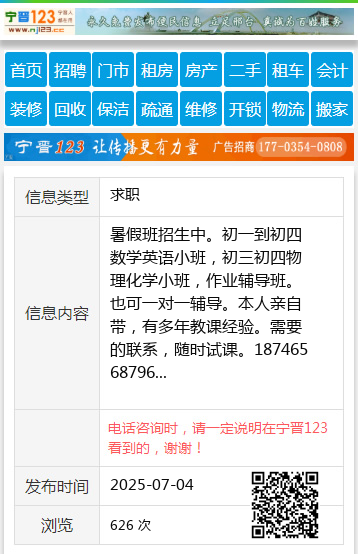暑假班招生中。初一到初四数学英语小班,初三初四物理化学小班,作业辅导班。也可一对一辅导。本人亲自带,有多年教课经验。需要的联系,随时试课。18746568796