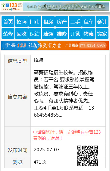 高薪招聘招生校长。招教练员:若干名 要求熟练掌握驾驶技能,驾驶证三年以上。教练员、要求有耐心,责任心强,有团队精神者优先。工资4千至1万联系电话:13664554855 【电话咨询时,请一定说明在望奎信息网看到的,谢谢!】 |