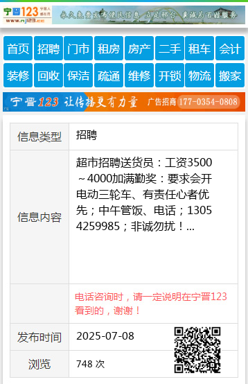 超市招聘送货员:工资3500~4000加满勤奖:要求会开电动三轮车、有责任心者优先;中午管饭、电话;13054259985;非诚勿扰! 【电话咨询时,请一定说明在望奎信息网看到的,谢谢!】 |
