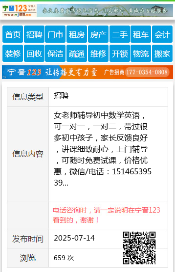 女老师辅导初中数学英语,可一对一,一对二,带过很多初中孩子,家长反馈良好,讲课细致耐心,上门辅导,可随时免费试课,价格优惠,微信/电话:15146539539 【电话咨询时,请一定说明在望奎信息网看到的,谢谢!】 |