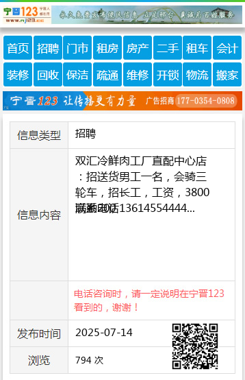 双汇冷鲜肉工厂直配中心店:招送货男工一名,会骑三轮车,招长工,工资,3800满勤200 联系电话13614554444