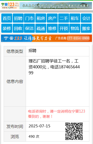理石厂招聘学徒工一名,工资4000元,电话18746564499