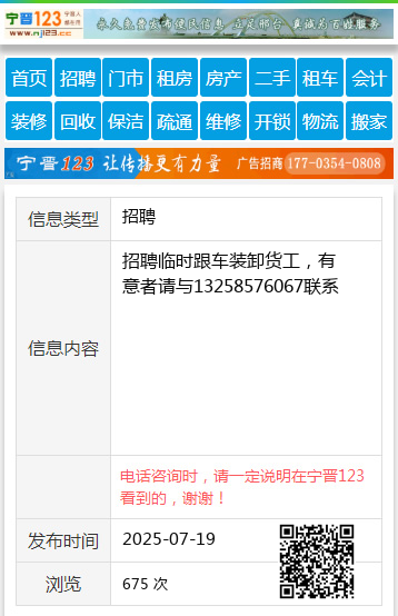 招聘临时跟车装卸货工,有意者请与13258576067联系