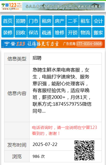 急聘生鲜水果电商客服,女生,电脑打字速度快、服务意识强,能耐心处理客诉,有客服经验优先,适应早晚班,薪资2000+,月休1天,联系方式:18745579755微信同号 【电话咨询时,请一定说明在望奎信息网看到的,谢谢!】 |