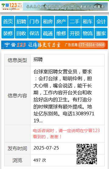 台球室招聘女营业员,要求:会打台球,聪明伶俐,胆大心细,嘴会说话,能干长期,工作内容开台关台和收拾好店内的卫生。有打追分的时候摆球有额外提成。地址亿东别苑。电话1308997119 【电话咨询时,请一定说明在望奎信息网看到的,谢谢!】 |
