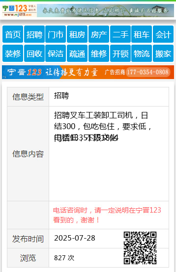 招聘叉车工装卸工司机,日结300,包吃包住,要求低,门槛低,不限文化 电话13351151814