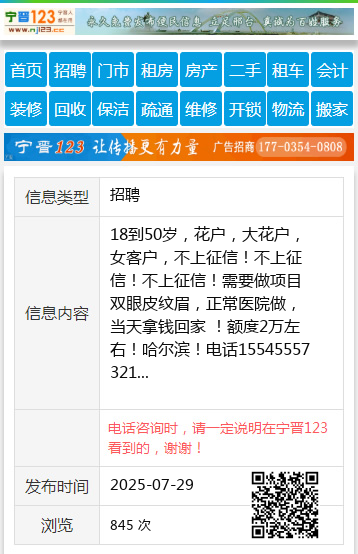 18到50岁,花户,大花户,女客户,不上征信!不上征信!不上征信!需要做项目双眼皮纹眉,正常医院做,当天拿钱回家 !额度2万左右!哈尔滨!电话15545557321 【电话咨询时,请一定说明在望奎信息网看到的,谢谢!】 |