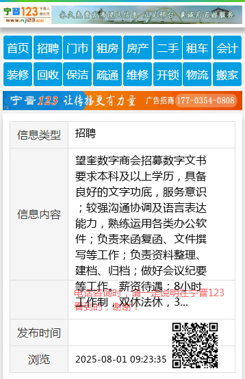望奎数字商会招募数字文书 要求本科及以上学历,具备良好的文字功底,服务意识;较强沟通协调及语言表达能力,熟练运用各类办公软件;负责来函复函、文件撰写等工作;负责资料整理、建档、归档;做好会议纪要等工作。 薪资待遇:8小时工作制,双休法休,3000-6000元/月,学习期满缴纳五险。 联系电话:13089971175