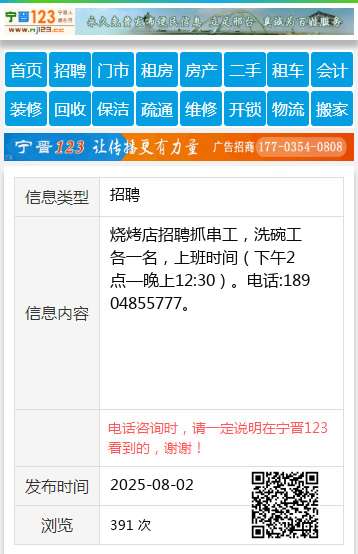 烧烤店招聘抓串工,洗碗工各一名,上班时间(下午2点—晚上12:30)。电话:18904855777。